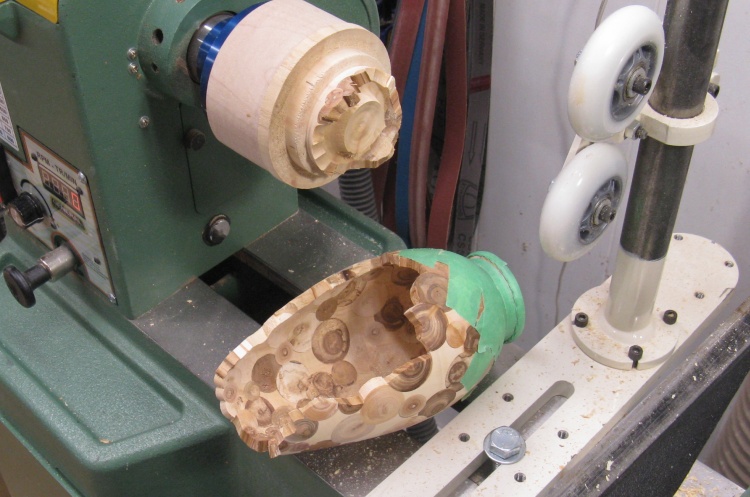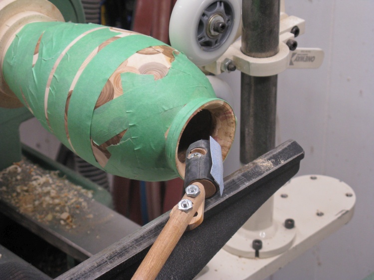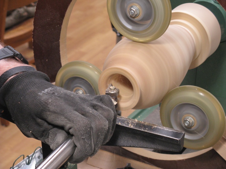 A large rubber-gripped chuck was used to hold the vessel top for turning and I went back to the three-wheeled steady to provide support. Here the bottom is ready for some work.