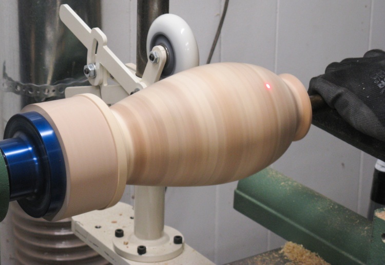 One problem with my shop-made 3-wheel steady seen in the previous photo is that the frame and top wheel extend above the turning and for an inch or two of the hollowing, obscure the laser used to guide the cut.