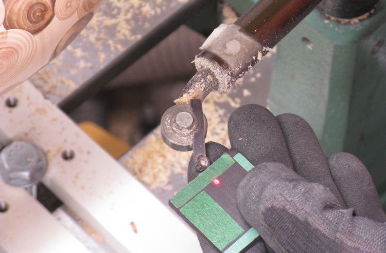With the little round carbide cutter set to an appropriate position, the laser is aligned so the dot is offset by the desired wall thickness.