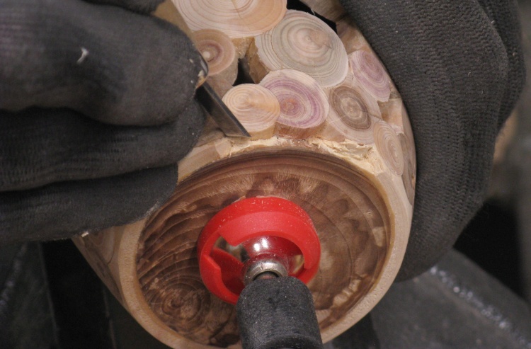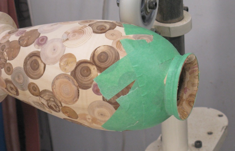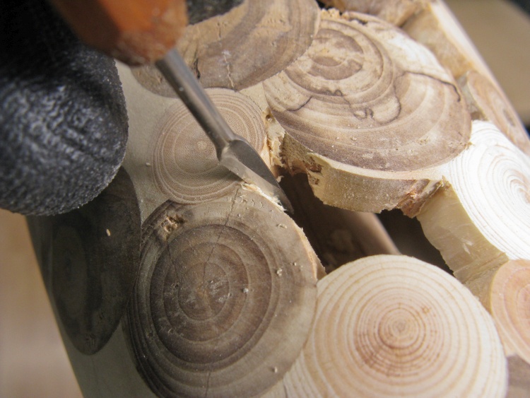 The vessel bottom was still the original maple and while technically end-grain, it hardly matched the discrete-log look of the rest of the vessel - so then a bottom log was going to be needed.