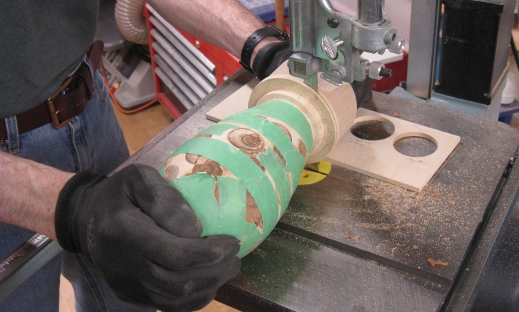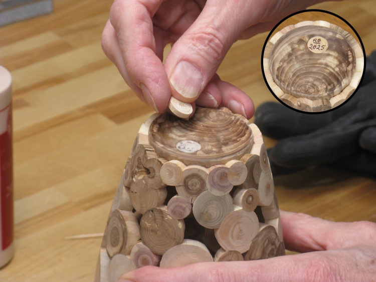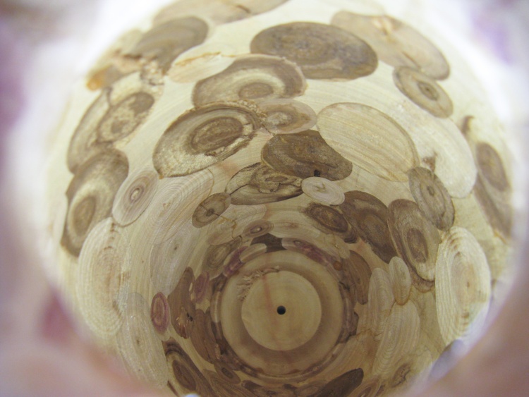 Off-camera: The excess maple was removed from the bottom, a hole formed and the bottom log glued in.