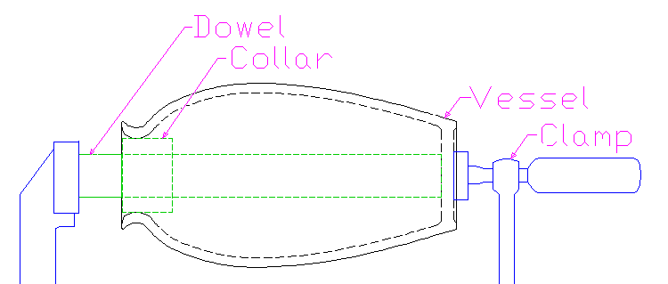 I implemented my usual hold-the-vessel-for-carving setup which consists of pinching the bottom using a long clamp and a dowel. This avoids any compressive forces on the vessel body. A collar that snugly fits over the dowel is sized to hold the inside of the neck to keep the vessel stable against sideways forces.
