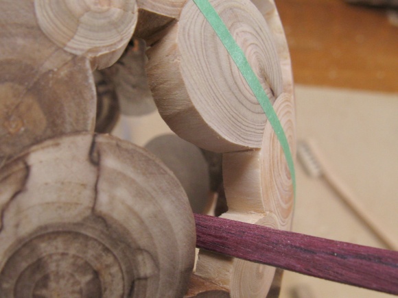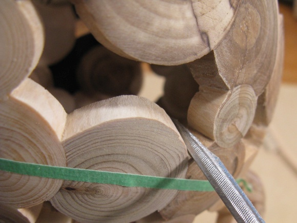 I wanted the log overlaps to be consistent around the vessel but working from just one end would take quite a while since the glue needs to dry - ideally the better part of a day - before drilling the overlapping log hole.