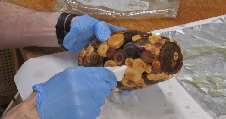 From my past experience in making hole-filled vessels, I reused a previously-successful technique of dipping the vessel for complete coverage. This shot shows a Zip-Lock bag with a nice pool of Danish oil into which the vessel is dipped a few times before being wiped off.