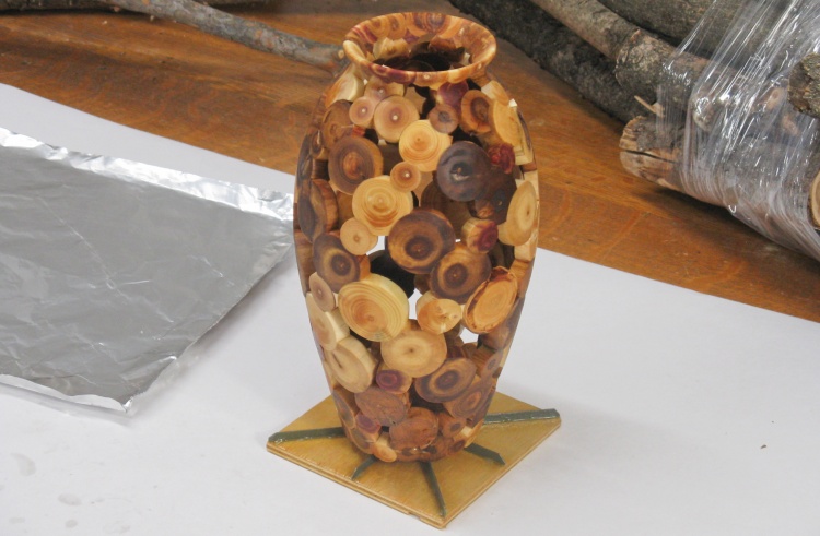 I had considered using the native branch shapes (typically slightly oval and irregularly curved) but I tried it out on another test vessel and it didn't look much different from a round profile. What was different however was the effort - it took way, way longer to do since each hole needed to be custom-shaped. So I was happy to stick with nice round logs in nice round holes.