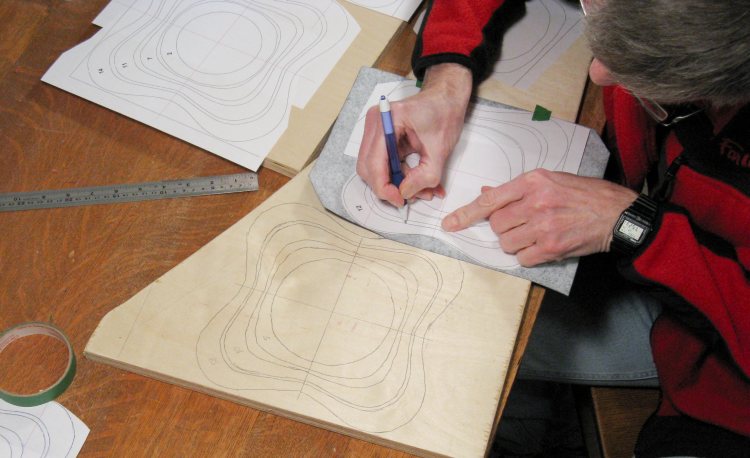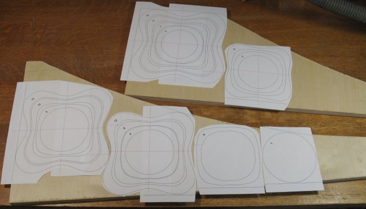 Unfortunately, there are no photos of me sitting at the computer trying to be being creative so you will have to use your imagination. However, the fruits of the mouse-manipulation are evident here in the plans that have been printed out full-sized and positioned on the wood.