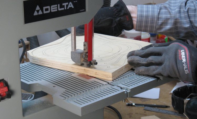 Each of the pieces was cut out to the proper contour using a little 8" bandsaw. This is the one I used before I got my "real" 14" bandsaw. It's small enough to just lift up and onto the bench and while it isn't very accurate, it was fine for this job.