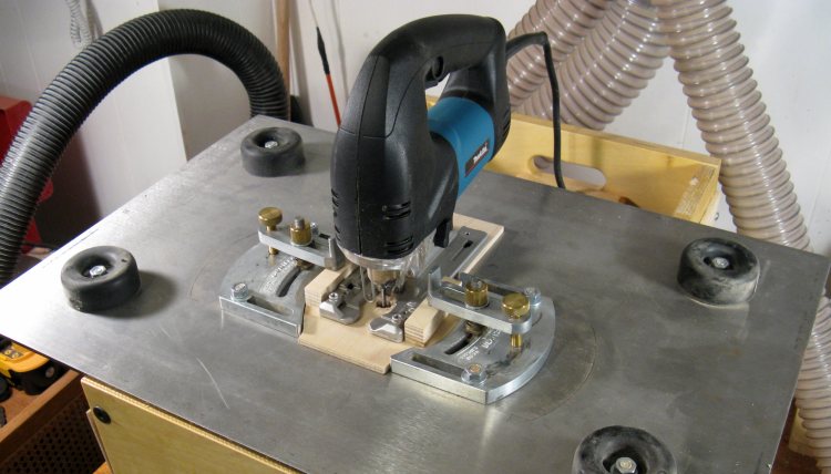The plywood was pretty tough so I needed a relatively tough saw to cut it, and one that could be stuck through a hole to cut out a center portion. I have a scroll saw that would almost fit the bill but it is somewhat on the wimpy side, so I thought I'd try out using a jigsaw mounted to my router table.