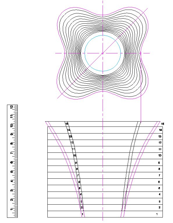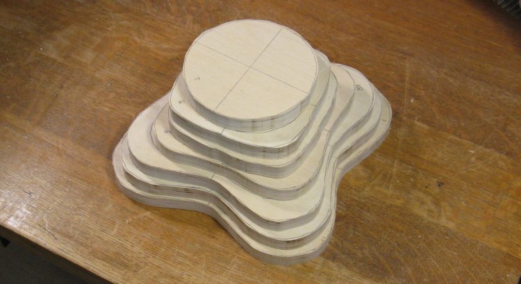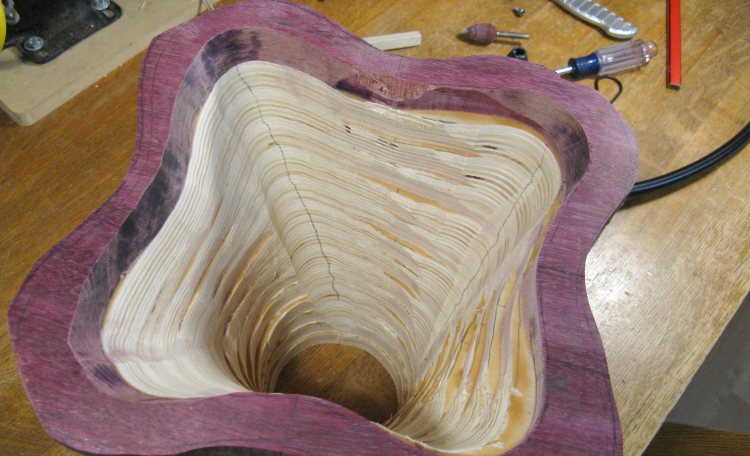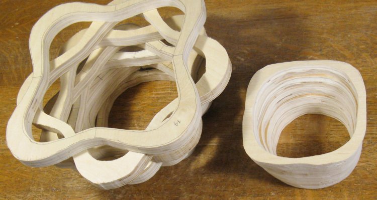 This is the largest composite piece, out of which I was going to get four layers for the vessel. To facilitate cutting them out, I drilled holes between the lines to be able to insert a saw blade.