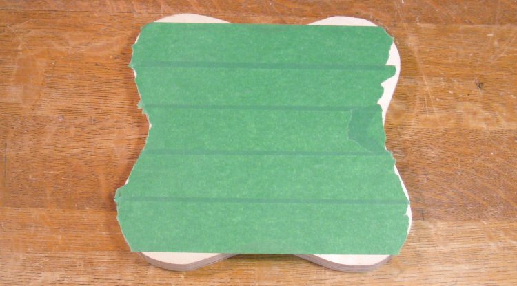 When sawing anything, the side toward which the teeth of the saw blade moves tends to chip when not cutting exactly with the grain. Some cuts with the bandsaw showed that 1/4"-long chips on both sides of the cut on the bottom were not unusual. To keep that face clean, I added masking tape to the bottom and rubbed it down so it stuck firmly. That was strong enough to limit the chipping to 1/16" or so.
