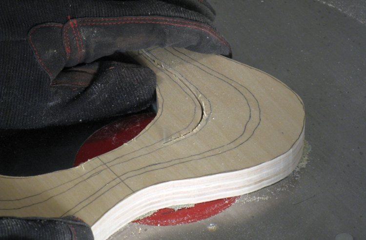 Here the top side has been mostly shaped and the near side has some preliminary grinding-to-thickness done and awaits the sanding drum to smooth things out.