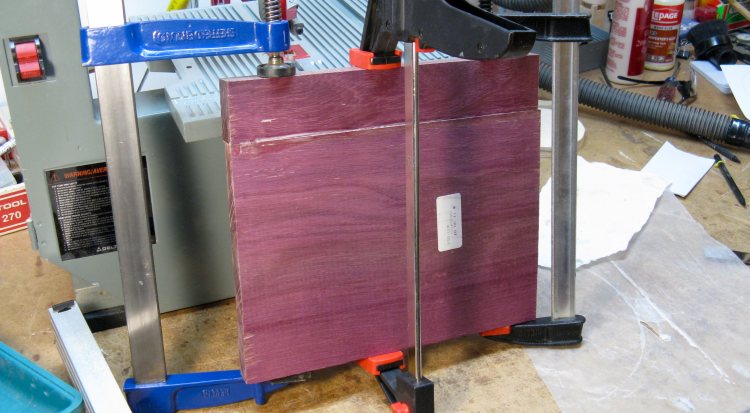 OK, so we're back on track here. I needed the largest piece ("the 15th storey") to be the Bloodwood. I had a 10"-wide plank but that wasn't wide enough by itself so it was laminated with an extra piece as shown here with the glued pieces being clamped.