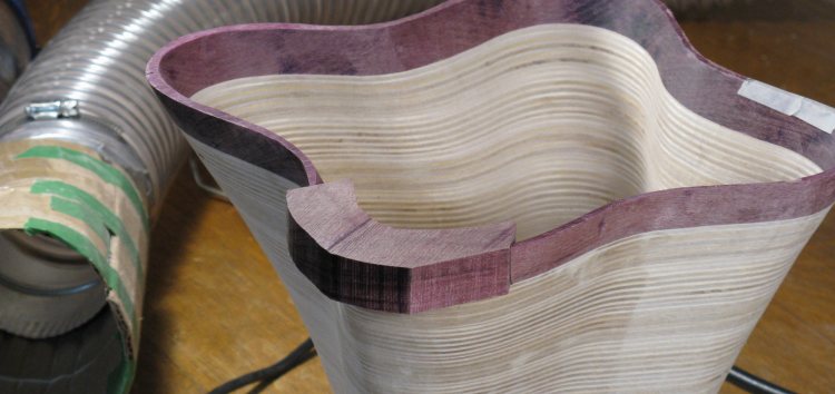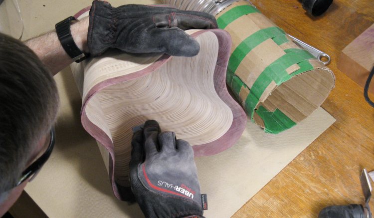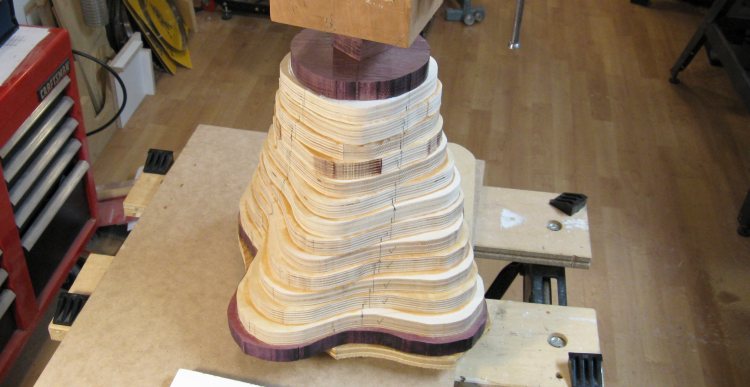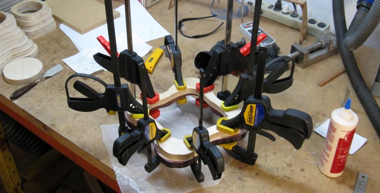 This was the first bit of gluing with the top Bloodwood layer added to the highest plywood layer. I've had problems gluing Bloodwood previously so I made sure I had enough clamps.
