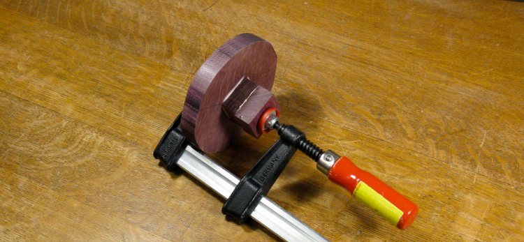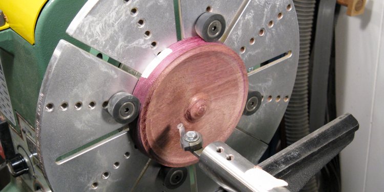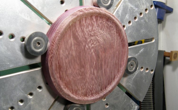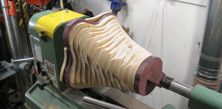 You can also see a regular piece of plywood at the bottom, also attached with latex adhesive. That was added to permit mounting on the lathe.