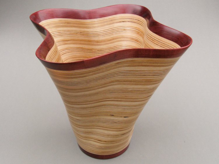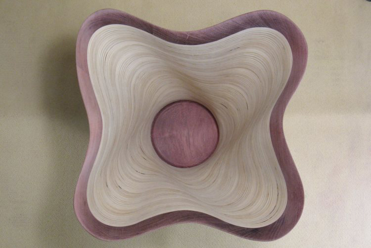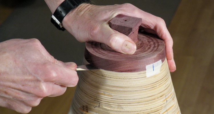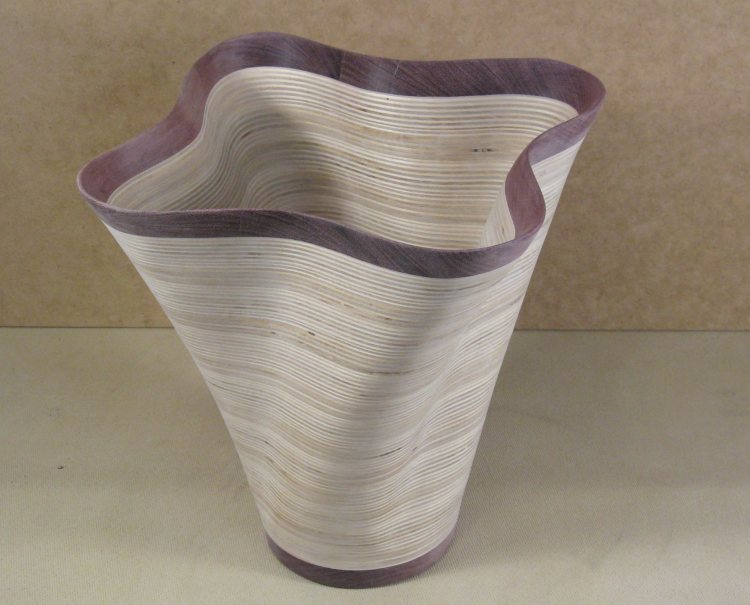 I'd had in mind for a while to make a vessel that wasn't turned on the lathe. Lathe-made vessels are of course round in cross-section, but making a non-turned one means that it could have a rather wider range of possible shapes. I went with a symmetrical design, although that wasn't really necessary. My original plan was for the "normal" vessel shown in the plan, but I decided early on that it could twist on it's way up and might look a bit more interesting. I followed the same general plan as the Kerry Vesper designs of having a solid wood layer on the top and bottom for contrast and choose the dark red Bloodwood for the caps.