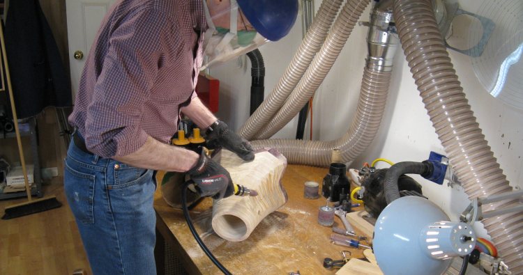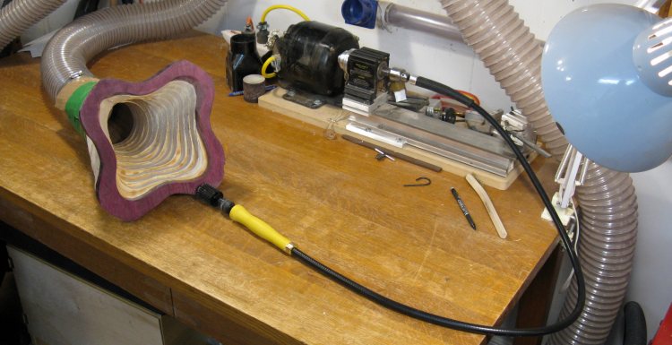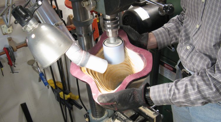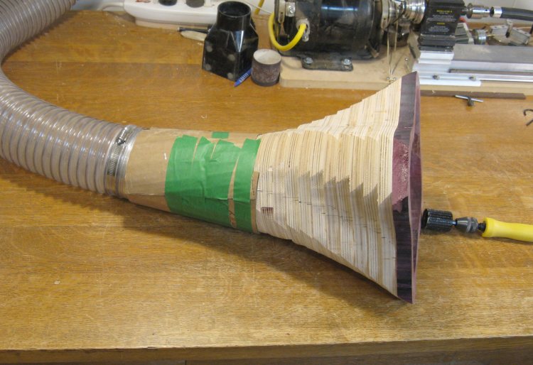 This is the inside-carving setup. I crafted a custom cardboard/masking tape adapter and attached the open bottom of the vessel to the dust collection system. This was highly effective at removing dust and I didn't need to wear a mask.