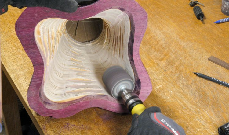 So after many hours of grinding and sanding, the inside was shaped and mostly sanded. In this picture, a finer 150-grit sanding sleeve has been used to remove the worst of the sanding marks.