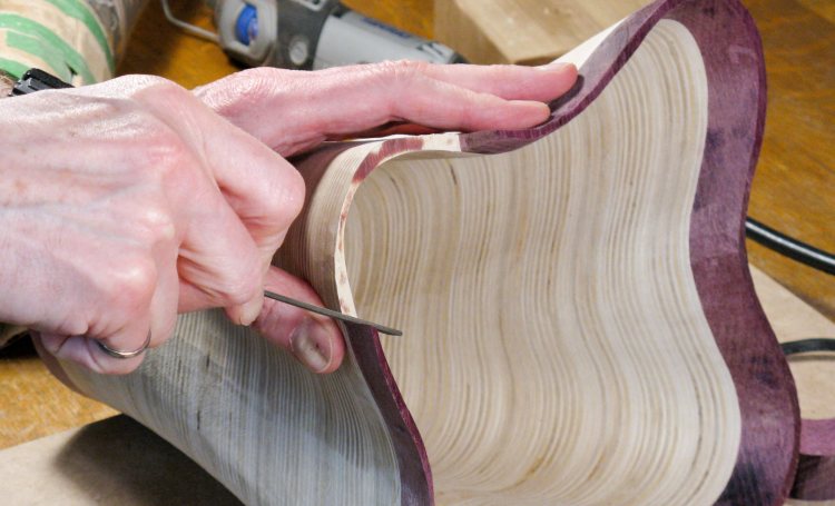 In this photo there are some pencil lines visible on the inside. I occasionally drew these in reflecting the centers of the corner based on the outside profile. This was to keep me shaping along the proper line.