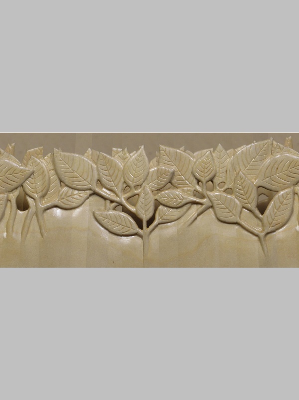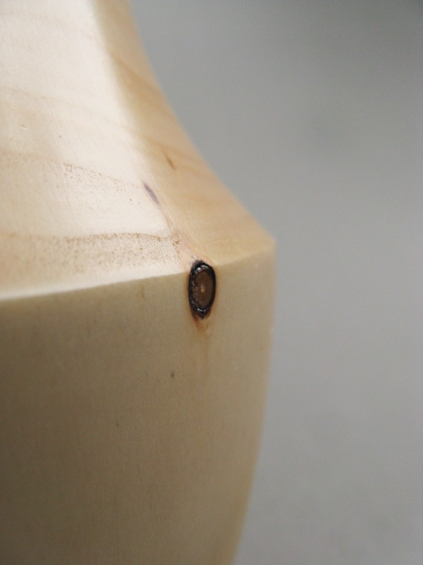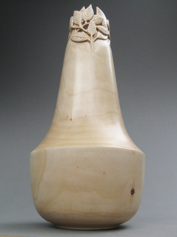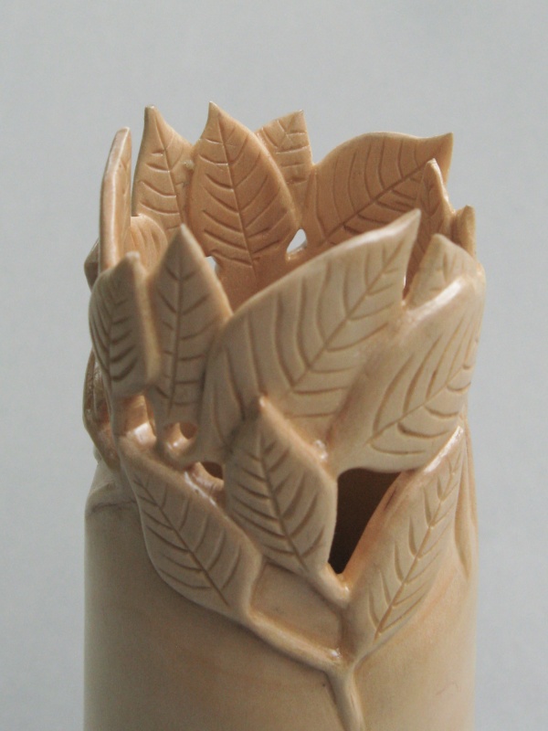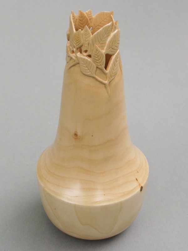 This piece was then dried out by heating it in the microwave oven. It started at 1030 grams and after about three hours of on-and-off heating, ended up at 690 gm. The weight (OK, technically mass) difference meant that it had lost about a pop-can's worth of water. It seemed pretty dry at that point and fortunately had no major cracks. I then finished turning it to the final size and to give it a bit nicer look, carved some leaves into the top whose shapes were made to match the actual tree leaves. The usual excessive amount of detail on the process is