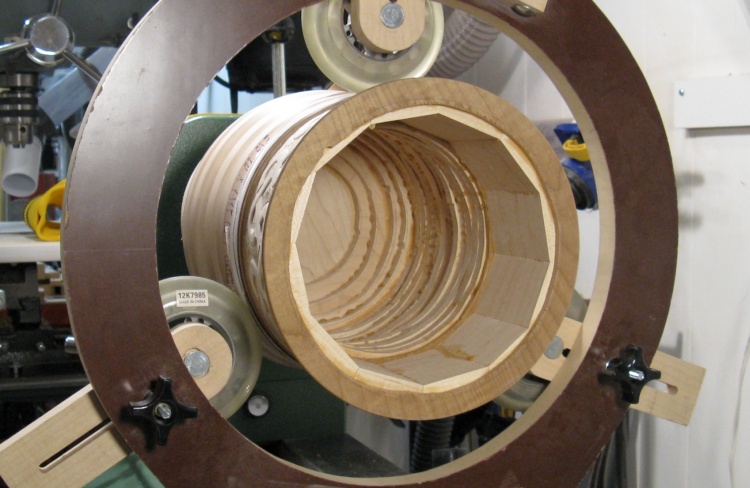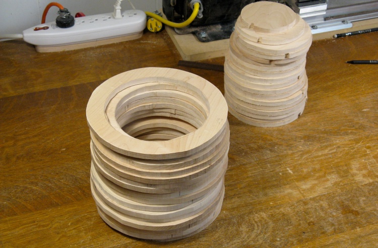When I was arranging the layers to have the grain in alternate 90° orientations, I made sure that the mating pieces on the two halves of the stack were in the correct orientation. And they weren't. Grrr.... This error manifests in the two layers that are the same darker* shade near the middle of the vessel.