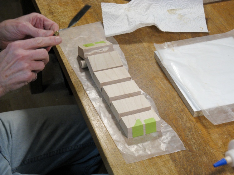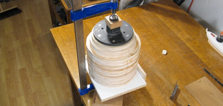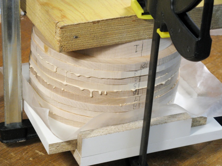 I glued up only half the layers at a time so the stack was more manageable. Here the bottom layers are being clamped while glue gooshes out.