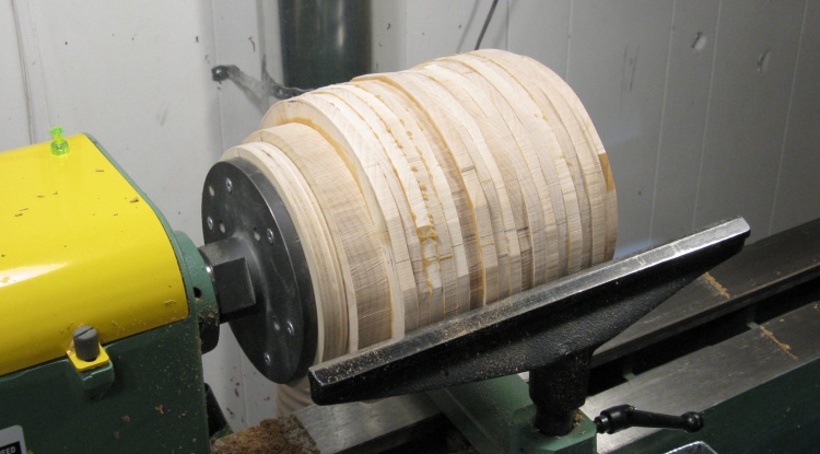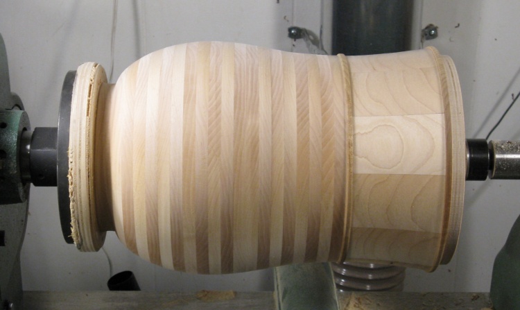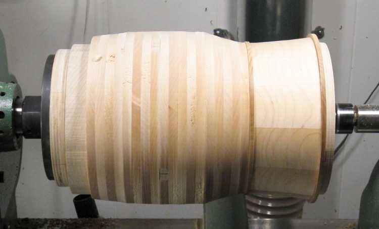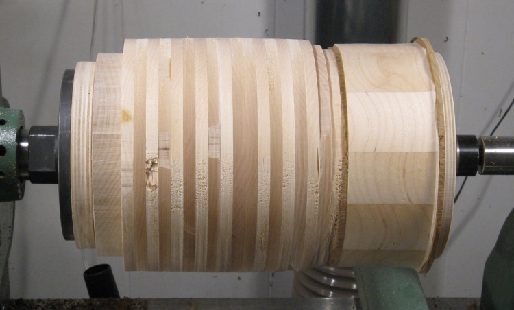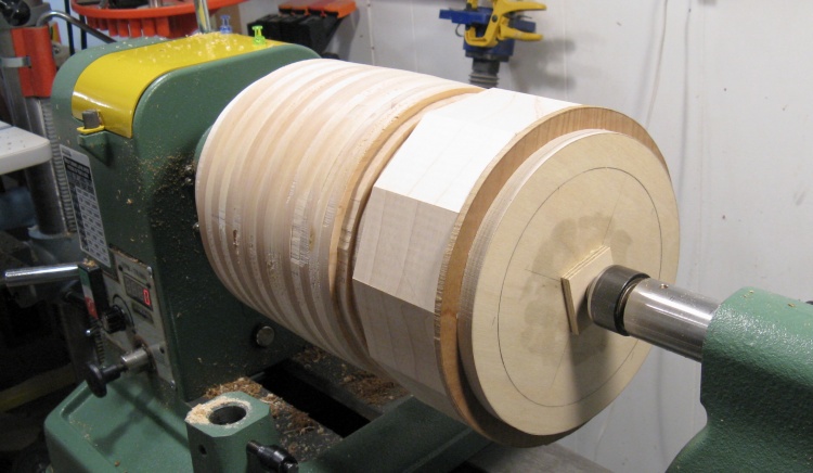 I was a bit disappointed (if unsurprised) to fail in finding any blanks large enough for this vessel even though I checked something like a dozen wood suppliers. The closest I found was a 12"-diameter log of 16 foot length, but that pretty much defines the term "overkill". So instead I just did some thinking about how I wanted to build it up from smaller pieces. I didn't want to do a large segmented piece, so I opted for horizontal layers for the main body since I was pleased with other vessels I had made with that technique.