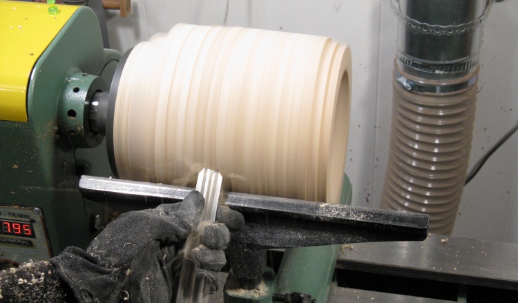 This is step 1 where I cut some ways into the vessel with a parting tool, making sure to avoid going too deep.