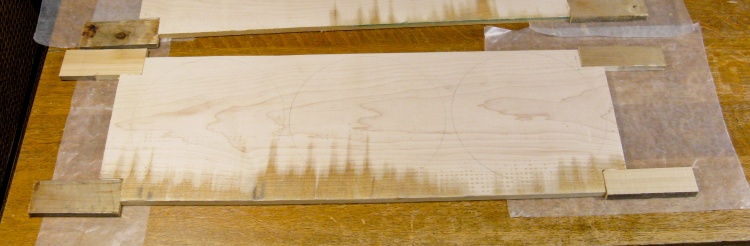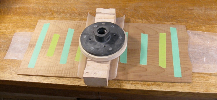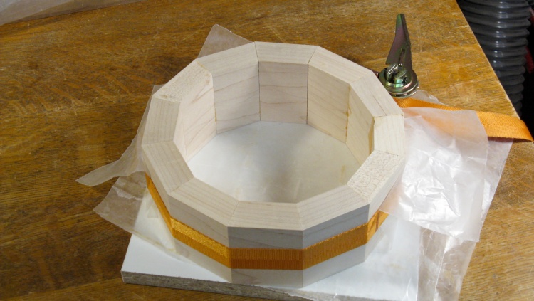 That plank width was smaller than the vessel diameter, so I edge-laminated the two pieces to get enough width. Here masking tape provides the clamping force for gluing while some weight keeps the pieces flat to the table.