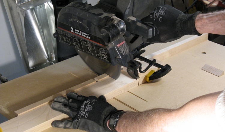Here the radial arm saw has been set for 15° and a stop added for the correct length. For each piece, I made a cut for the first end, then flipped the board over, moved it to the stop and made the second cut.