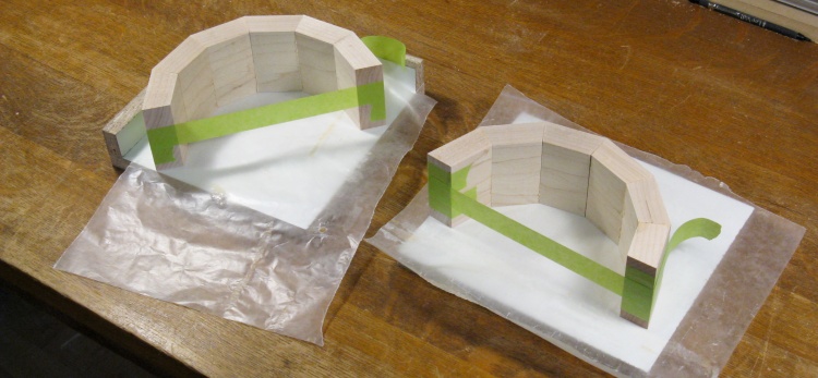In this picture, I'm applying glue to a six of segments that have been masking-taped together. These will be bent into a half-circle shape to dry.