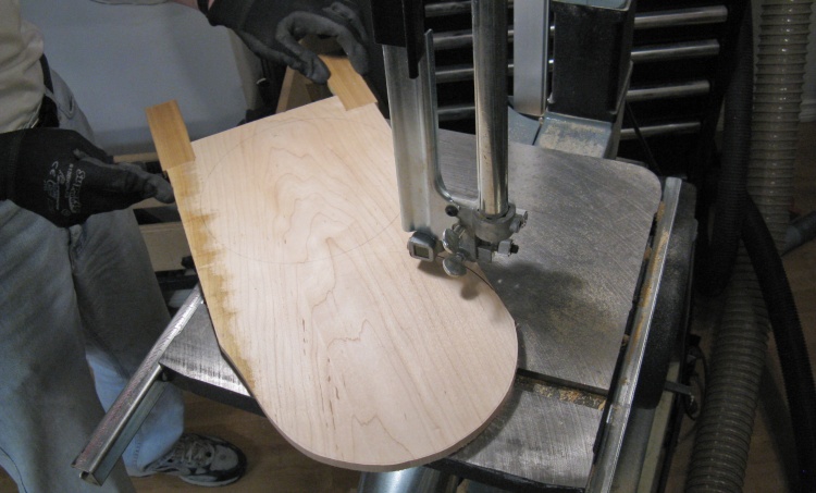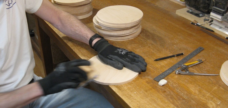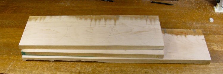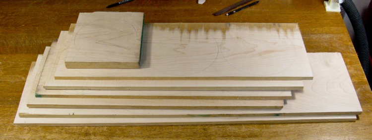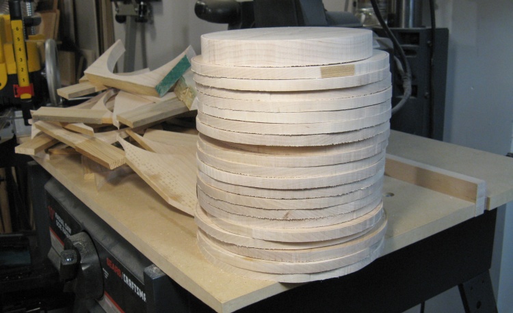 Once that was done, circles of a bit more than 8" diameter were marked on all the boards with a compass and the 20 circles cut out with the bandsaw.