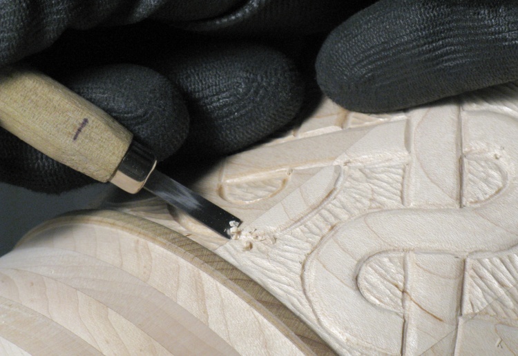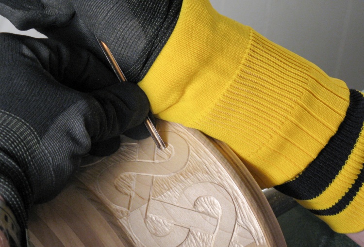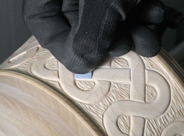 The general process for carving was to first outline the pattern with a small gouge to establish the edges of the wide lines forming the knots.