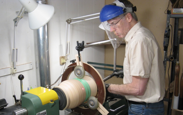 The yellow cuff is a professional woodcarver wrist guard to let me rest my wrist on the top edge of the vessel for extended periods. Any resemblence to an old soccer sock of Sue's is purely coincidental.
