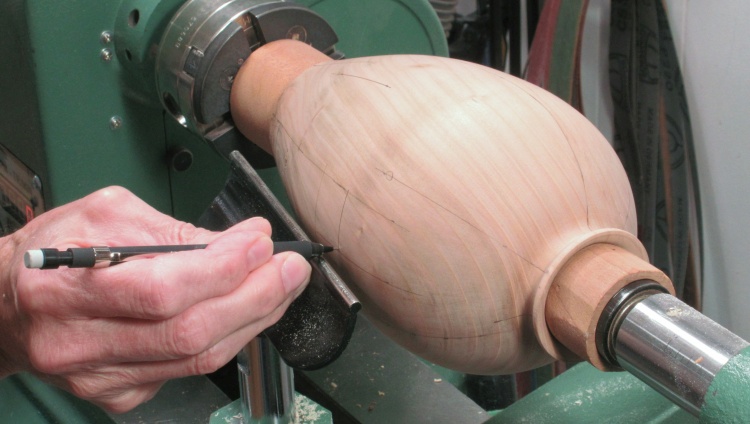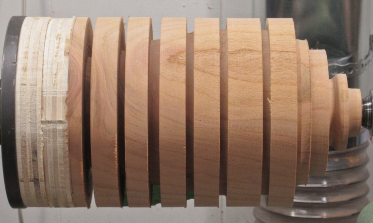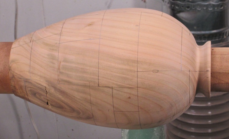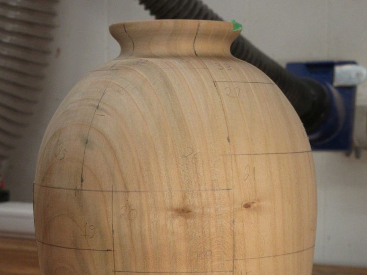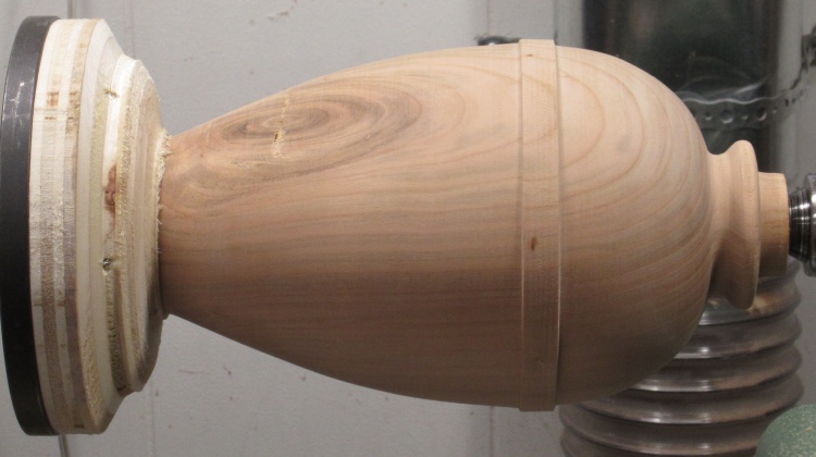 The wood needs to be stopped numerous times to measure the diameter getting cut and once I went back to the wrong slot and ended up making it smaller than it was supposed to be. ARRRGHHHH! Fortunately I was able to recover by scaling the vessel down by only 5% from the original size, so it wasn't as big a disaster as it originally seemed.