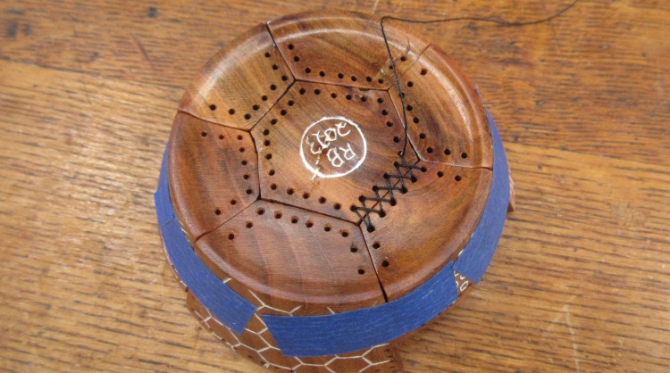 Not all the hole marks were easy to see when I was doing the drilling so I wanted to do a check before starting the sewing. So once again the tape came out and I stuck the vessel together to be able to inspect hole positions. This is a shot inside the vessel before the top couple of layers were added.