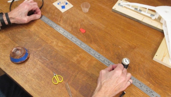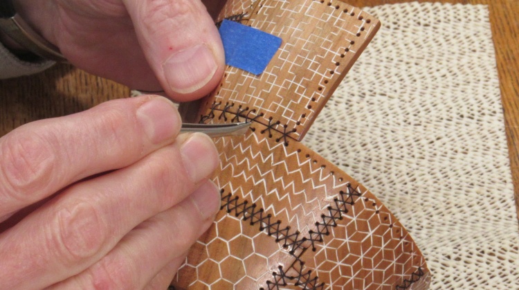 I started at the top and marked hole positions on the way down. In this photo I'm using the pin awl to make divots in the wood at each hole location.