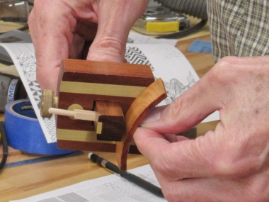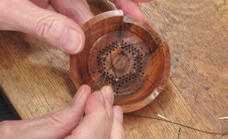 I decided that the little cherry-wood conical anchors weren't really needed (partly because I ran out of super-glue to hold them) and instead switched to using a drop of a latex cement that would hold the thread ends in their holes. Here I'm using a toothpick to add the glue to the thread ends after the temporary toothpick anchors are removed.