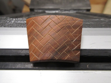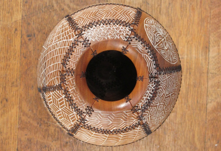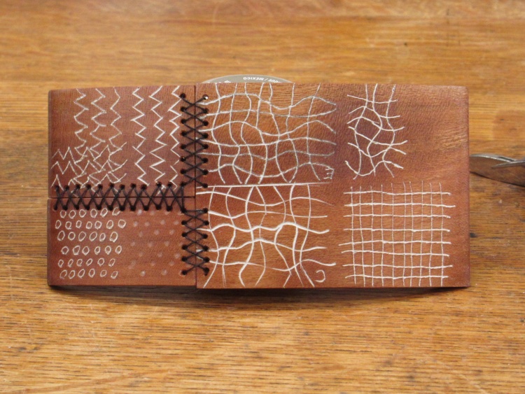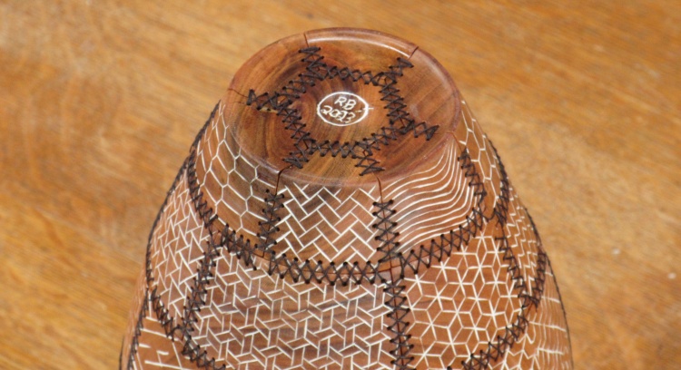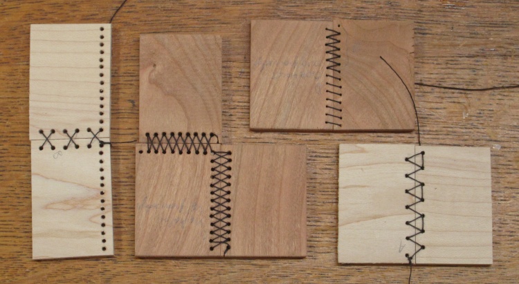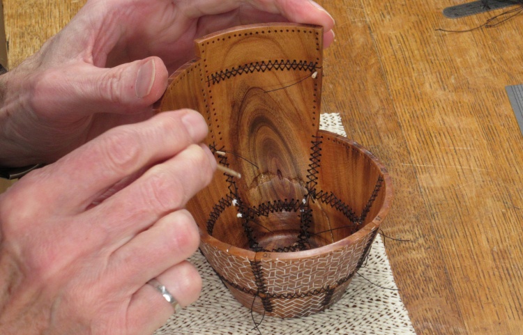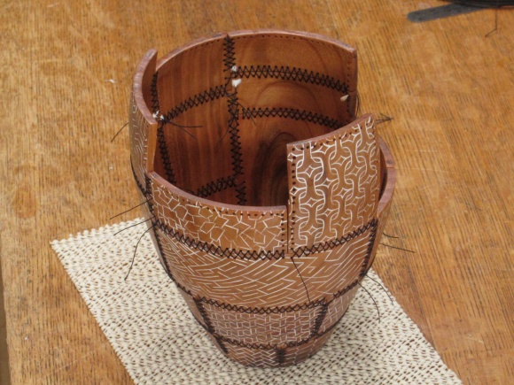 I've used sewing techniques to fabricate a box hinge in the past and this design is an extension of that idea. As usual I did some on-line searching to see what kind of existing work was out there but was a bit surprised when I failed to turn up any examples of sewn-together vessels. It's hard to believe that there isn't something like this out there somewhere but perhaps it's weird enough to at least be rare.