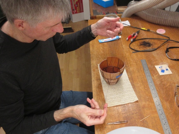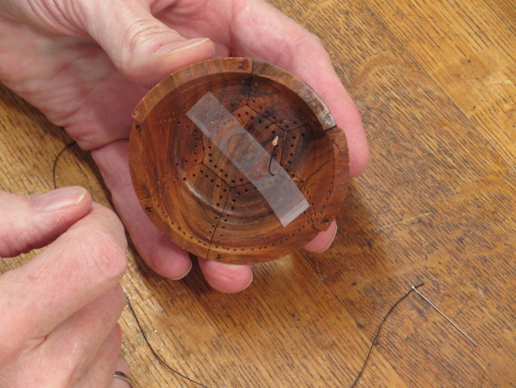 The top row was a bit trickier since some of the holes were tough to see through the vessel opening, and impossible to see if there were fingers holding a needle in the way. So for the last pieces I put a small flashlight into the vessel to provide illumination around the holes and used tweezers to handle the needle.