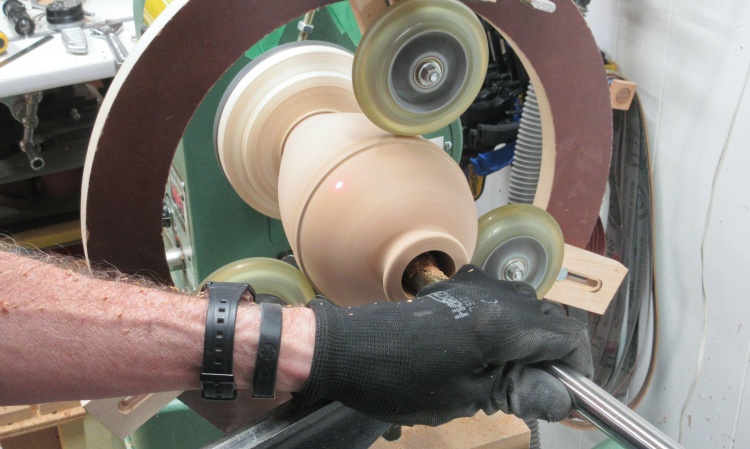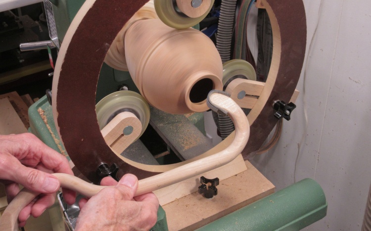 After the hollowing was done, I did a bit of internal sanding using this jig and another made to fit through the vessel neck.