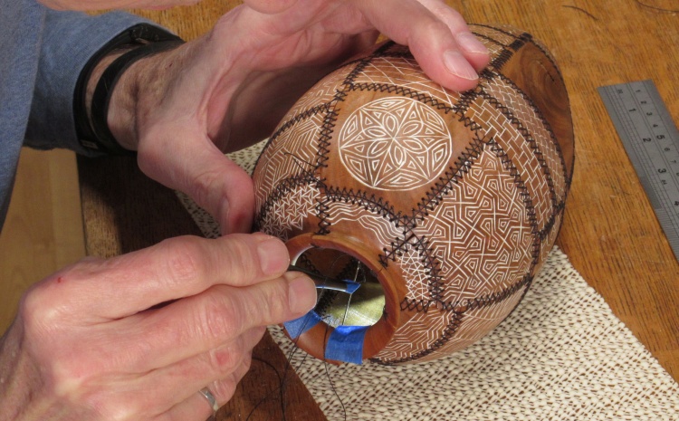 When the glue was dry I mounted the vessel back on the lathe, employing a large dowel to reach inside and contact the bottom. This avoided putting pressure on the not-very-strong neck and top flange. The dowel was equipped with custom ring to keep the neck from rattling around.