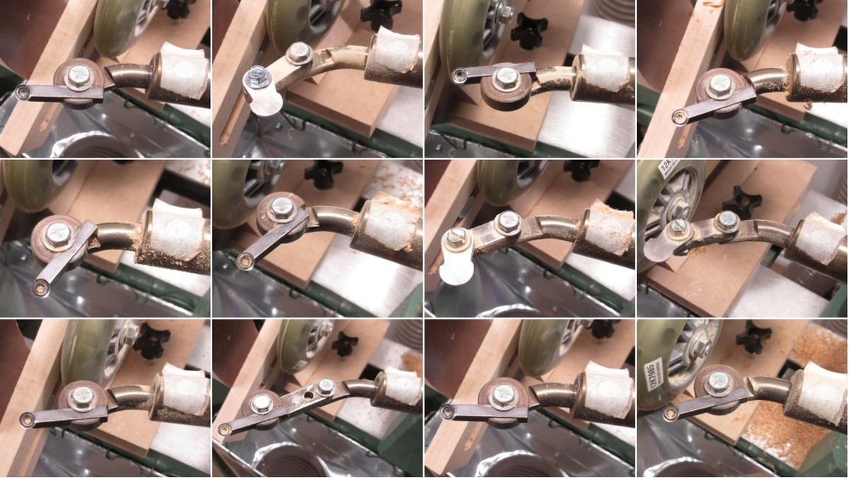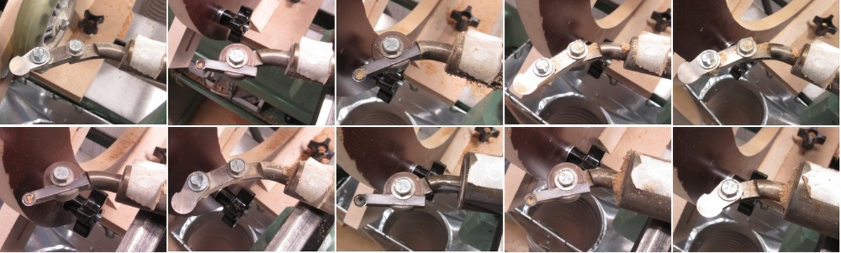 This setup is complicated by the narrow neck which limits the sideways movement and even how far off to the side the cutter can be set so that it can still get through the neck. The upshot of all this is that the cutter needs to be adjusted frequently. This montage shows the first dozen or so settings used which include a couple of different cutters and an extender.