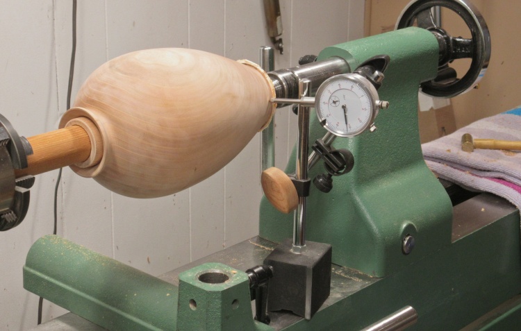 There was no center reference on the newly-cut-off bottom so I set up the dial gauge to help with the centering. I rotated the vessel by hand while observing the gauge and tapped the vessel bottom over periodically to move it closer to being centered.