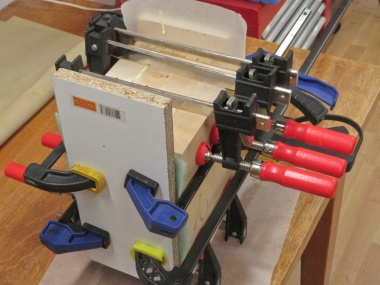 Once all the pieces were marked and de-taped, it was time to get into the drilling. I started with the bottom corner pieces, aided by a crude holding jig.