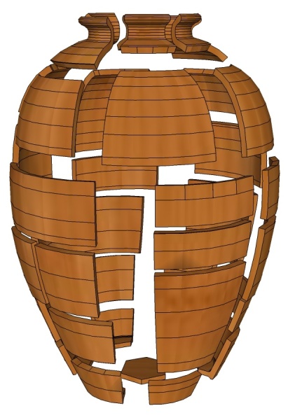 Each cut between patches removes a bit of material so to avoid gaps when it went back together I would need a consistent number of cuts on any vertical line on the vessel. The same applied for any horizontal ring around the vessel. I ended up choosing six cuts (coincidentally) for both those parameters.