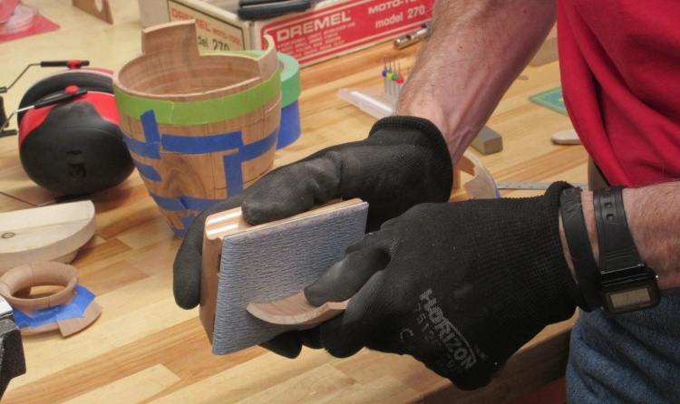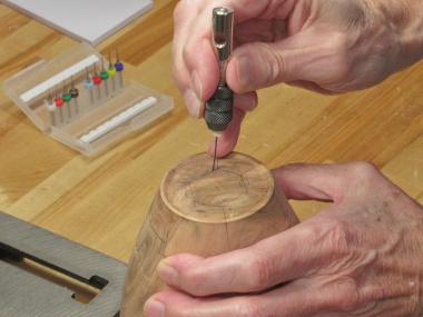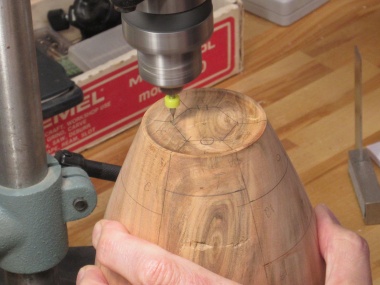 While the last couple of coats of finish dried, I thought I'd make some thread anchors. These tiny cherry cone-shaped pieces will be inserted in a hole to wedge against the threads and hold the ends firm. The plan is to insert them from the inside and give them a dab of super-glue to hold them in place to keep the vessel from unravelling.