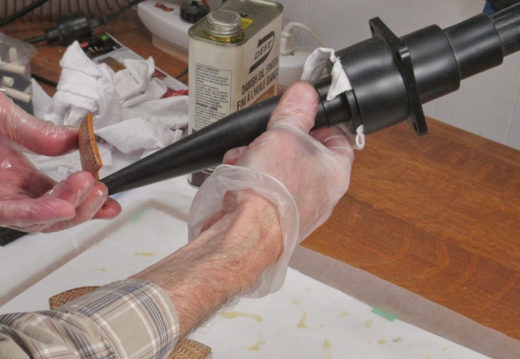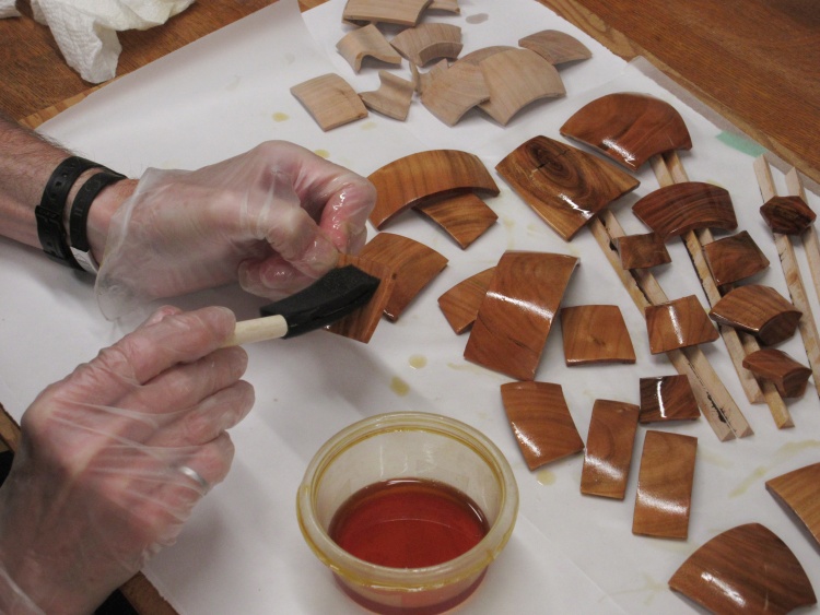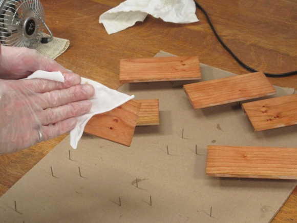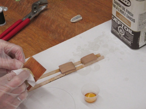 Then finally I could add the last two coats of Danish Oil. This shot shows the finish going on with a foam brush. As before they sat wet for 1/2 hour before the excess was wiped off with a clean cloth.