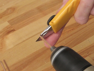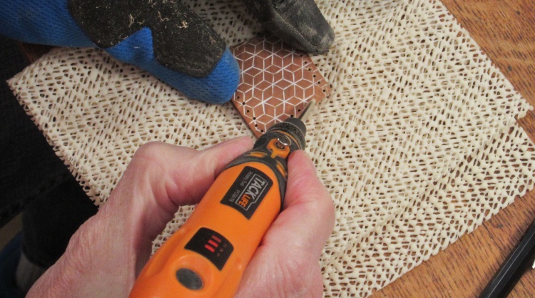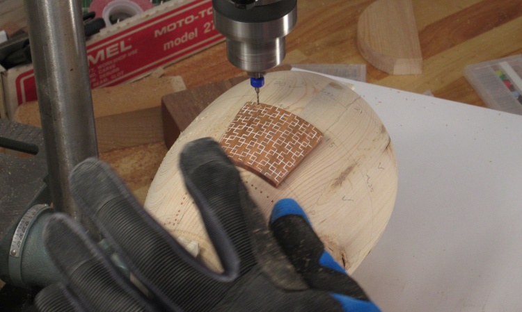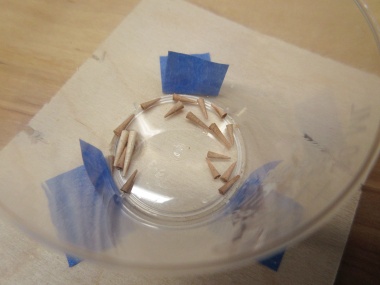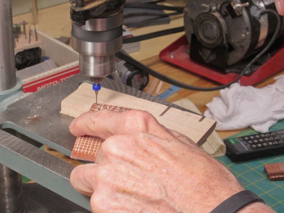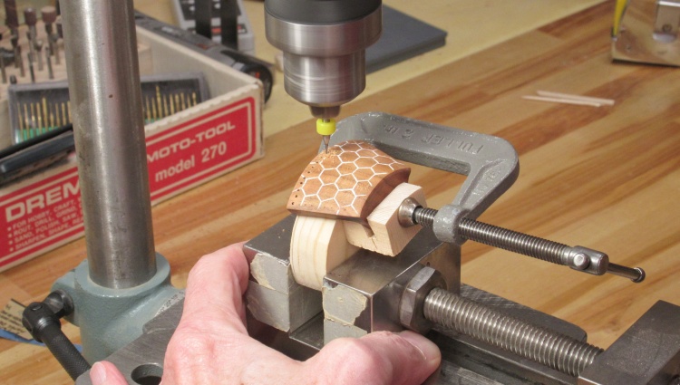 Each piece was taped down with a loop of masking tape on the bottom and then held more firmly in place with fingers to do the actual drilling.