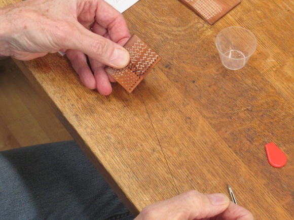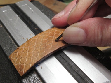 I used the previously established parameters of holes spaced at 1/8" and 0.1" from the edge and I made sure to pencil on marks for matching holes on both sides of each joint. When the marking was done I cut apart the pieces, used the pin awl to poke location markers and then removed the tape.