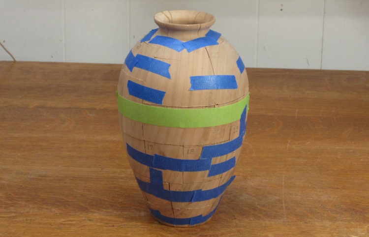 With the pieces correctly positioned, the blue masking tape was pulled off and the vessel received a layer of Scotch Magic tape over all the seams.